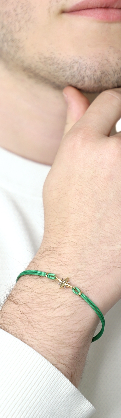 This charm bracelet features: a doble tone 8-point compass rose crafted in 18kt gold and hugged on both ends by a bright green 2-strand rope that creates the bracelet itself.