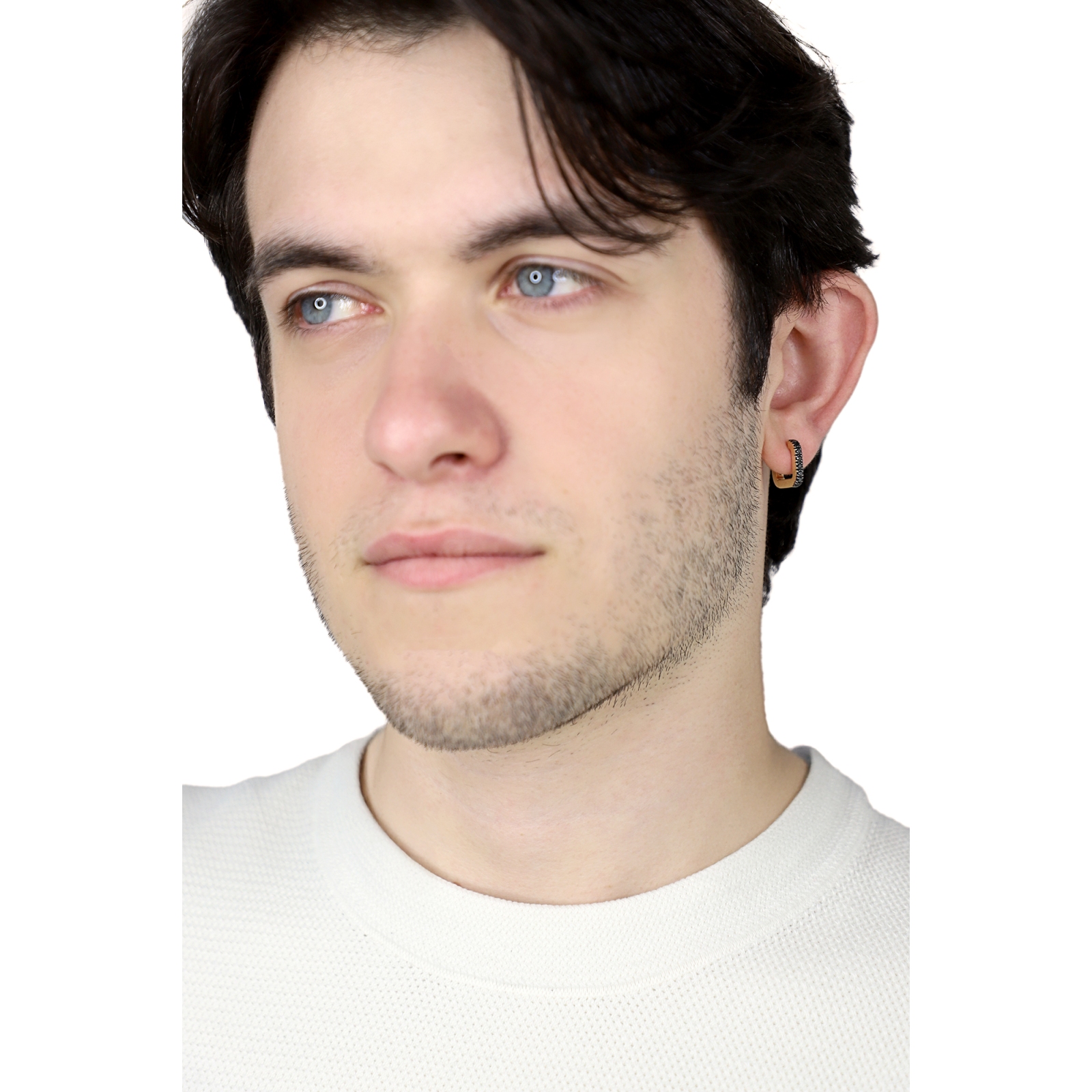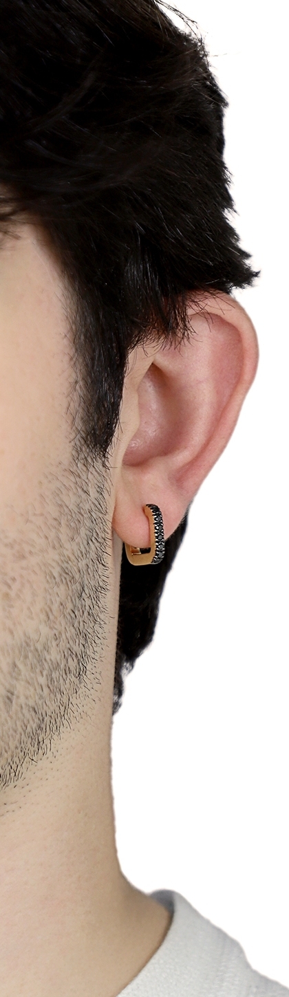 This single hoop earring provides extreme comfort and will add a touch of elegance to any outfit. It is entirely crafted in 18kt yellow gold and it features skilfully set black diamonds. The prongs that encapsulate the diamonds are blackened in order to enhance the intensity of their colour.