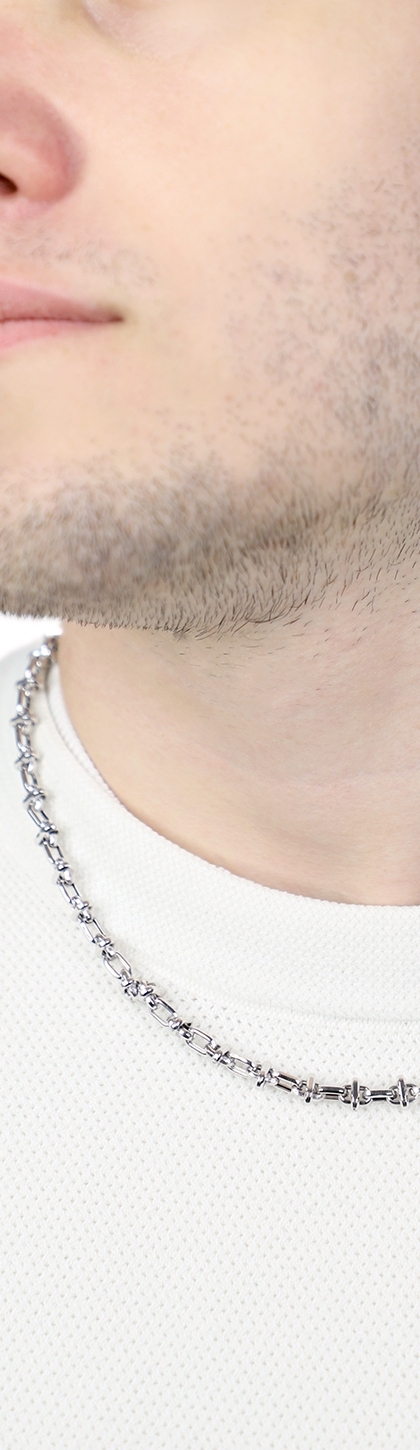 Geometric and masculine style for this iconic industrial chain necklace. Crafted in 18kt white gold, it features intricately interlinked chain elements forming a bold yet refined design.