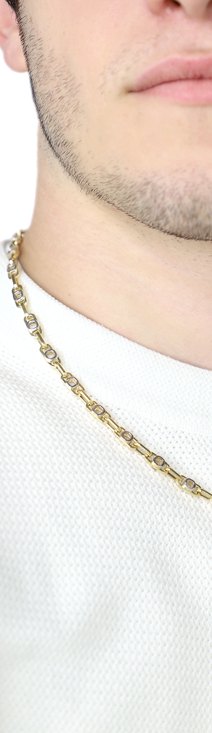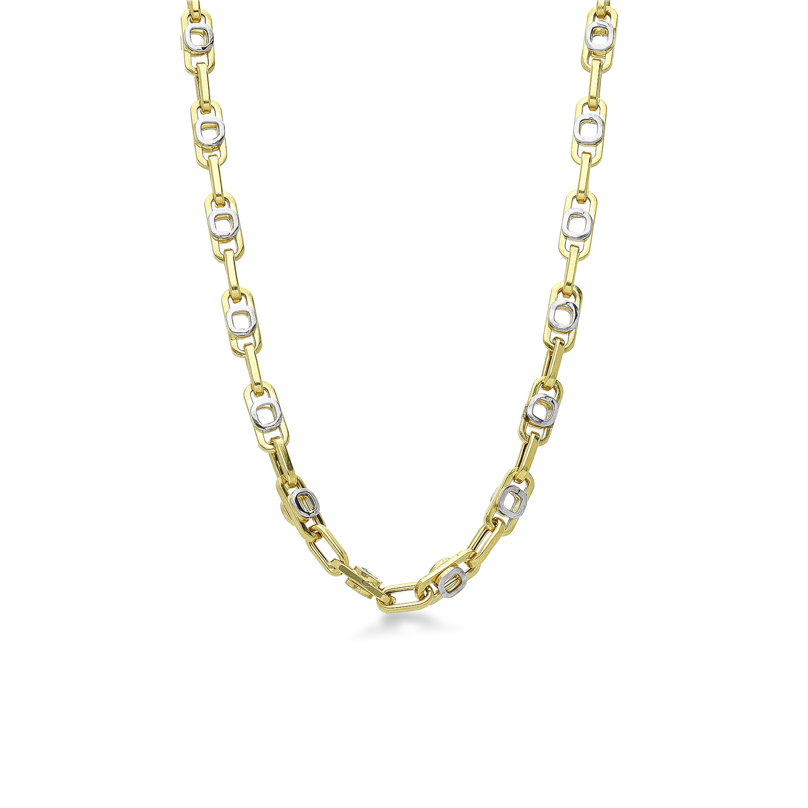 Bold and sophisticated, this 18kt gold necklace draws inspiration from industrial design. Meticulously crafted, it features sleek rectangular links in yellow gold with smooth, polished edges, beautifully intertwined with smaller, square white gold links that add contrast and dimension.