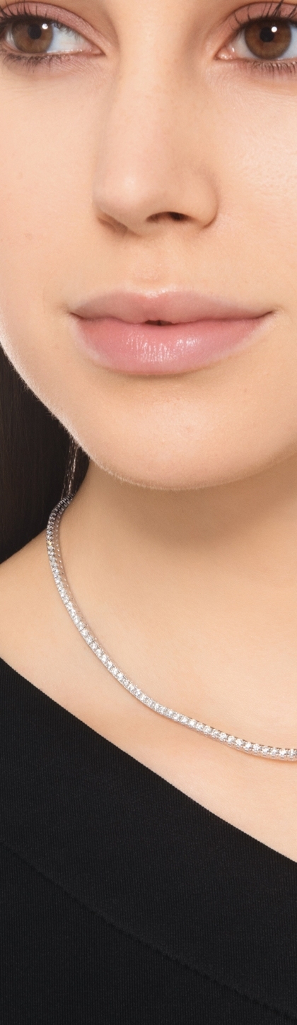 This white gold diamond tennis necklace is crafted in 18kt white gold and due to its simple yet timeless design, it can be paired with other diamond pendant necklaces, rings and earrings. You can also wear it with one or more of our tennis bracelets for a complete and shiny look.