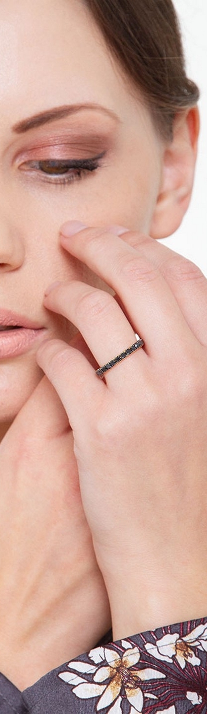 Eternity ring in 18kt yellow gold with black diamonds set in blackened prongs. The combination of the classic yellow gold paired with the boldness of the black diamonds bring a modern, give an edgy twist to this band ring. Moreover, the darker prongs enhance the intense colour of the black diamonds highilighting their striking charm. This band ring is ideal to be stacked with other rings both in plain 18kt gold and with precious gemstones.