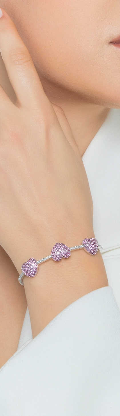 Bracelet in white gold 18k with diamonds and three hearts in pink sapphires