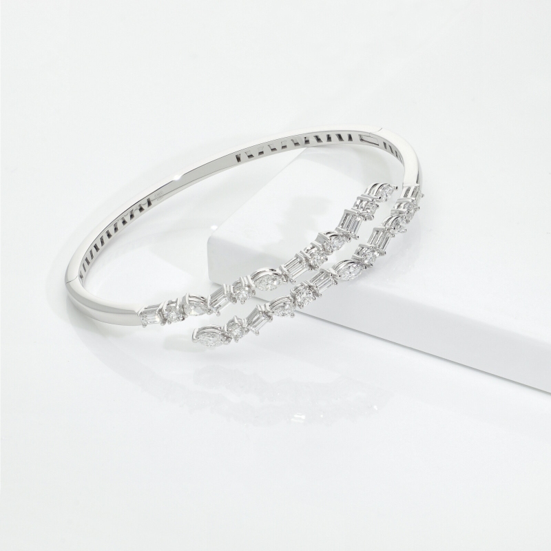Three diamond cuts embellish this piece of jewelry: the pear-cut whose drop shape is romantic and delicate, the marquise-cut is extremely elegant and sophisticated while the baguette-cut is rectangular and is the perfect modern touch to this timeless bracelet.