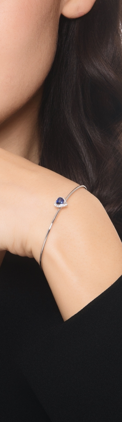 Thin bangle bracelet with diamonds and heart-shaped blue sapphire in 18kt white gold