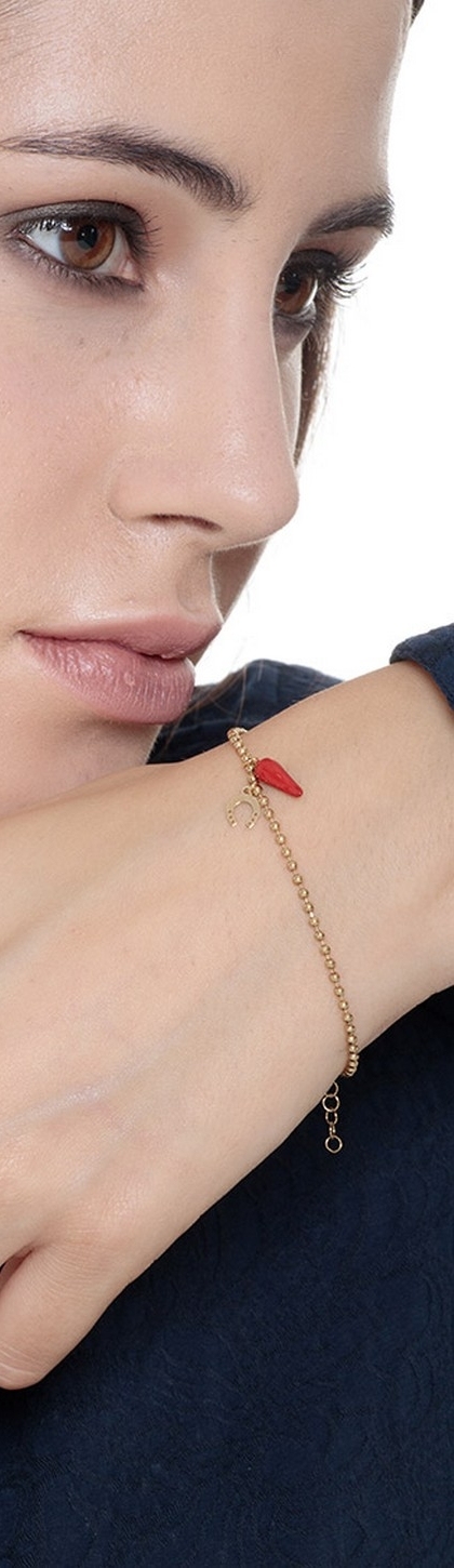 18K yellow gold bracelet with a red lucky horn and a horseshoe charm