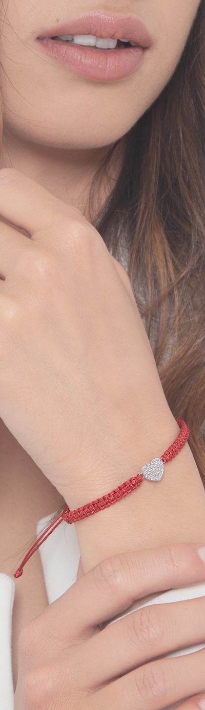Red fabric cord bracelet with heart charm in white gold 18k and diamonds