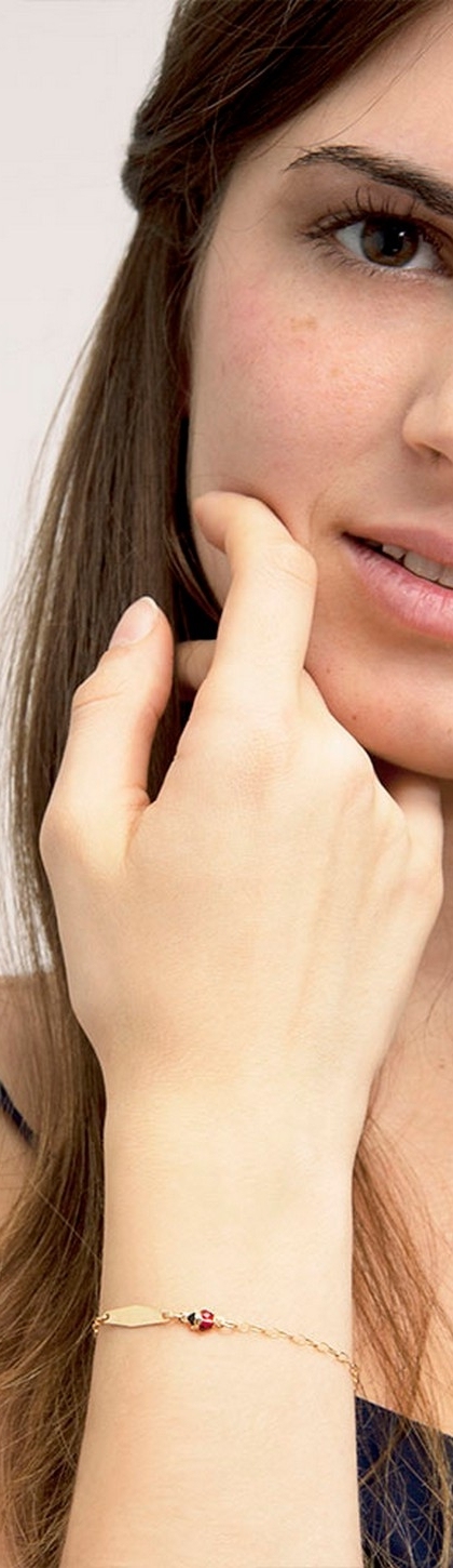 This 18kt yellow gold nameplate bracelet features two tiny enamelled ladybugs. The thin oval links of the chain perfectly complement the more classic shaped nameplate. This bracelet is customizable with a personal engraving and it can become the perfect gift for a birthday, a baptism or a fist communion.