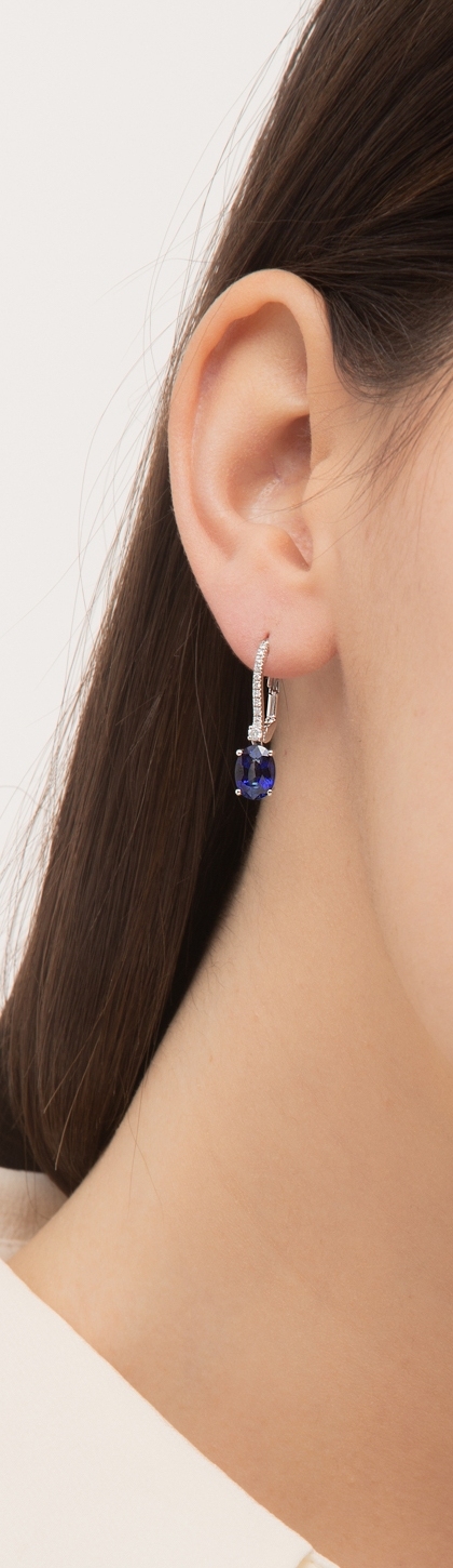18k white gold drop earrings with diamonds and blue sapphires