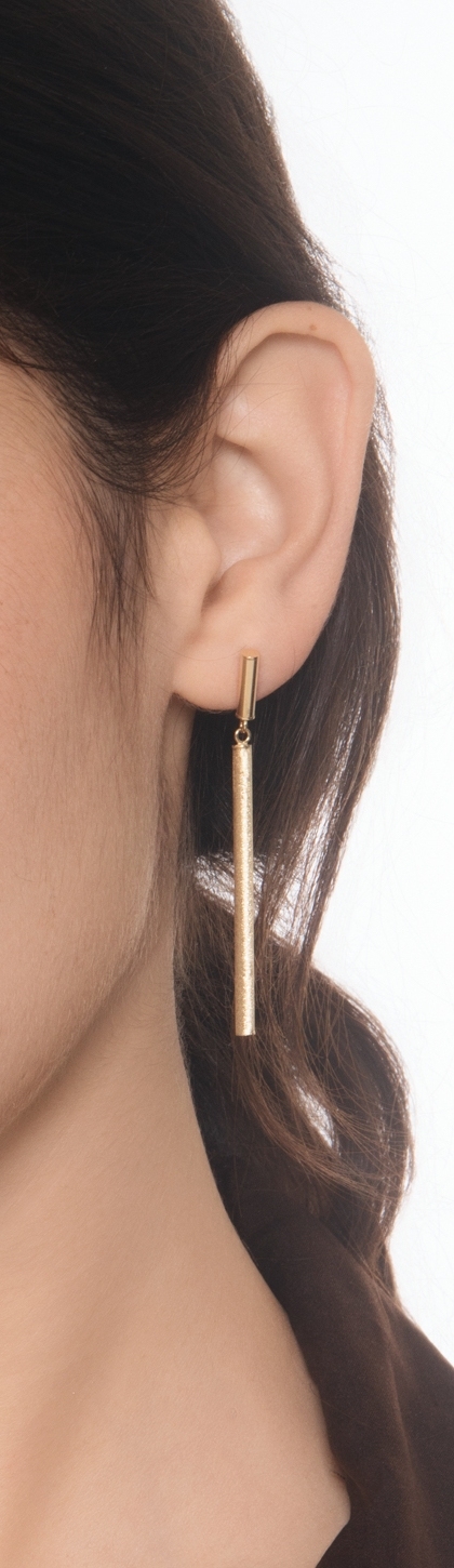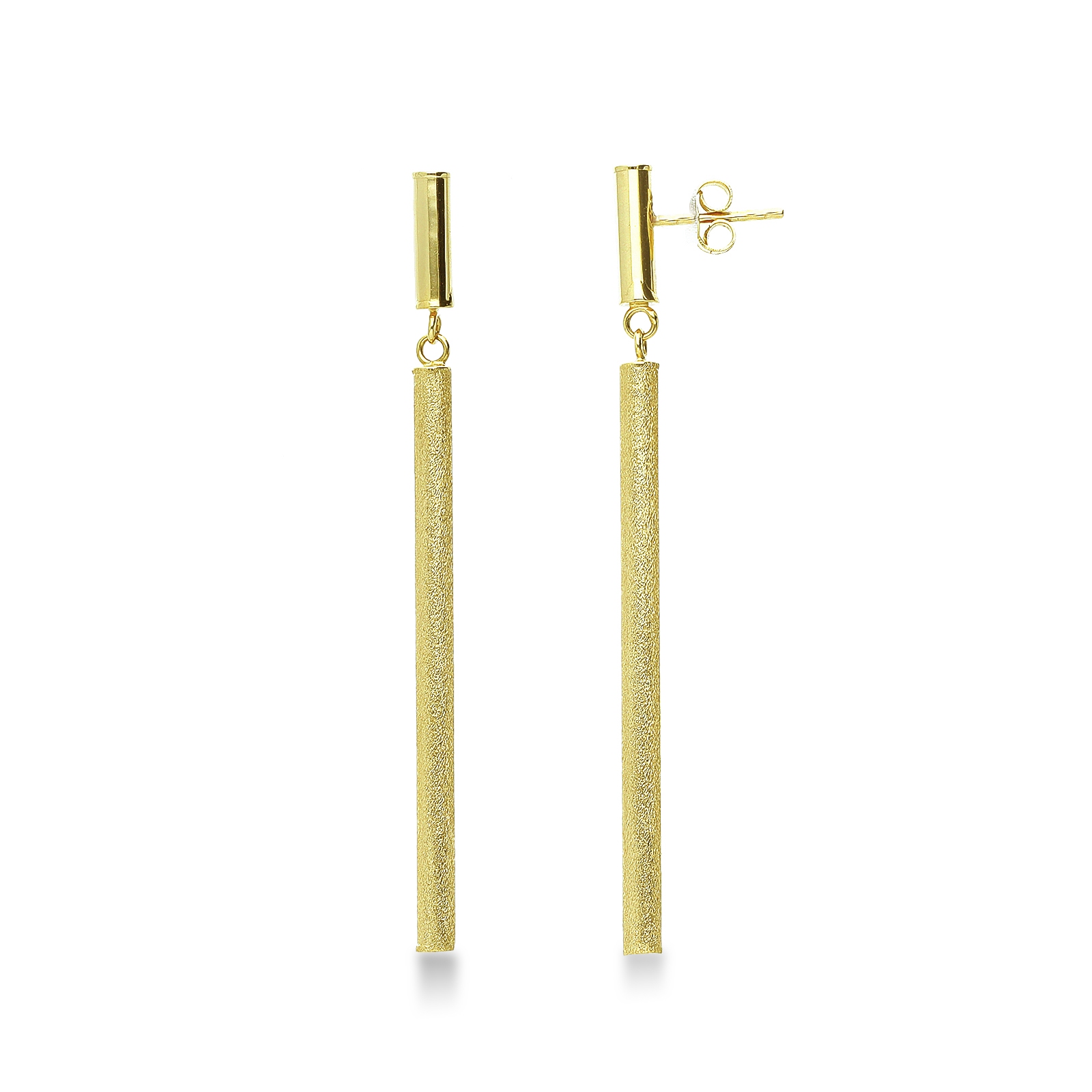 Pendant bar earrings in 18kt yellow gold. They measures approximately 6cm in length and due to their modern design they can be worn on a daily basis and with any outfit.
