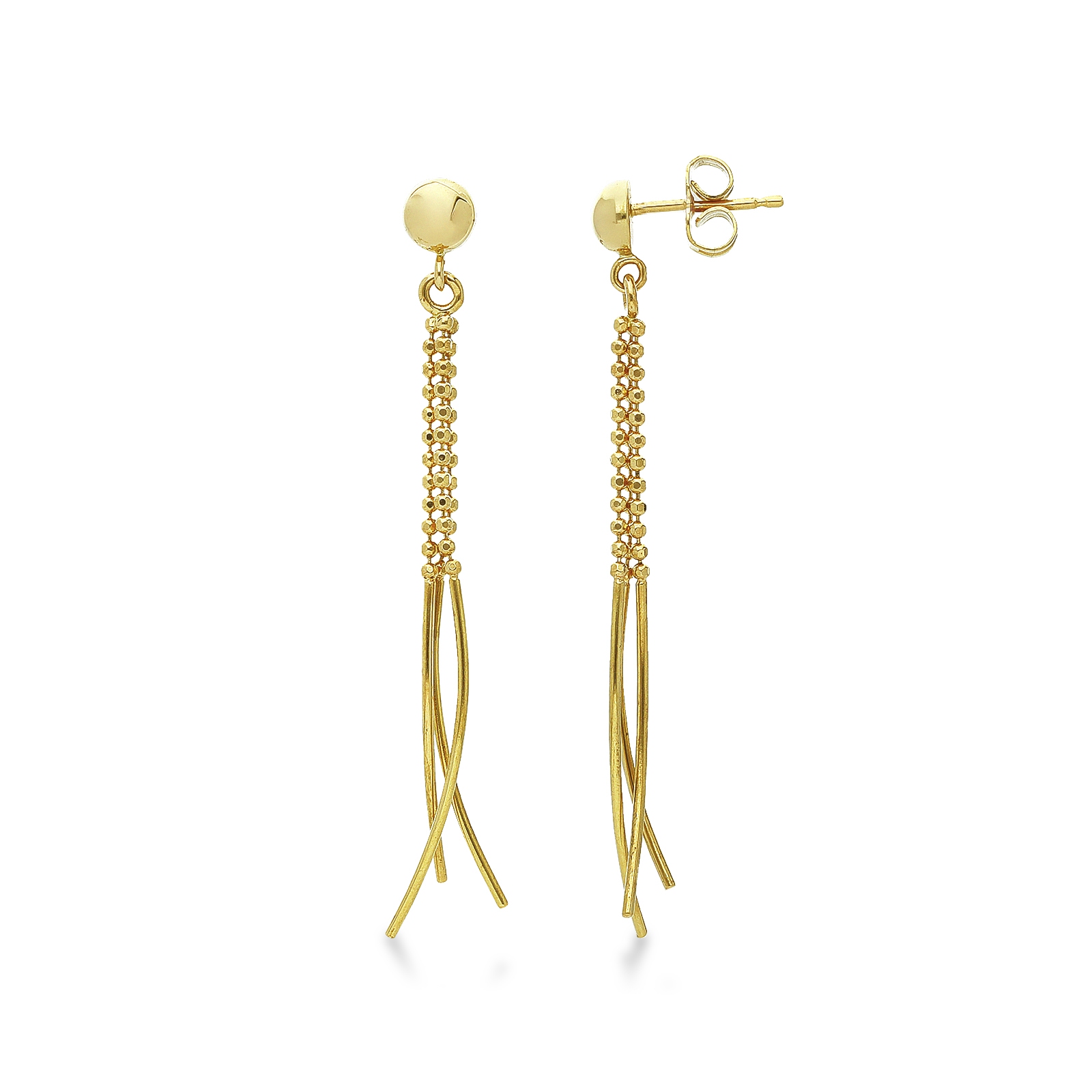 Bohemian style defines these pendant earrings, making them flowy and lightweight. Crafted in 18kt yellow gold, they feature a round golden stud from which three fine beaded threads dangle, each ending in a slender bar.