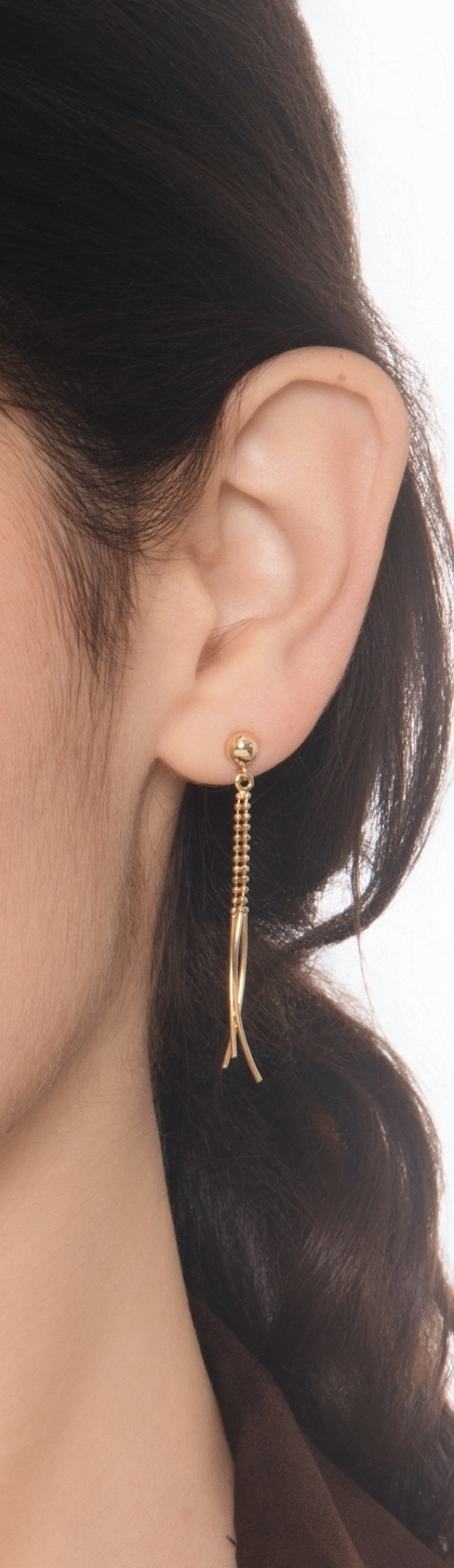 Bohemian style defines these pendant earrings, making them flowy and lightweight. Crafted in 18kt yellow gold, they feature a round golden stud from which three fine beaded threads dangle, each ending in a slender bar.