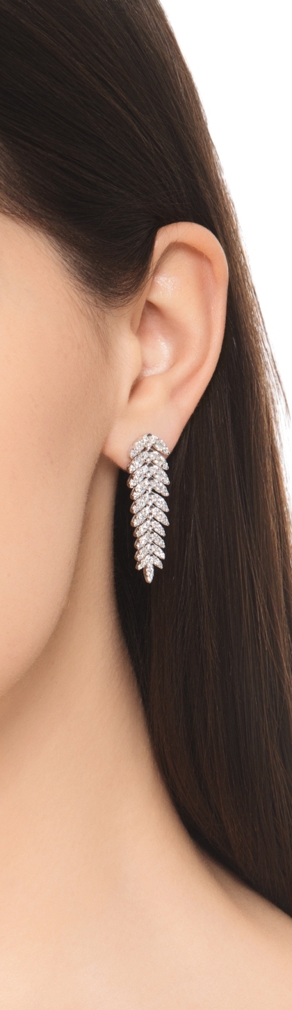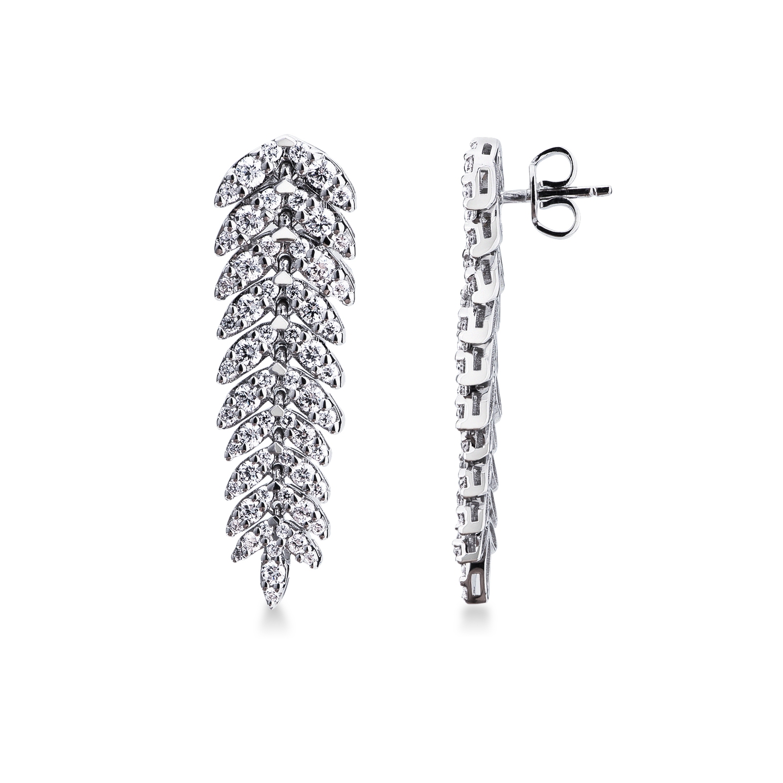 Pendant diamond earrings featuring a delicate leaf design. They are crafted in 18kt white gold for the ultimate elegant look while the diamonds are all brilliant-cut with color H and clarity VS which perfectly balance shine and quality.