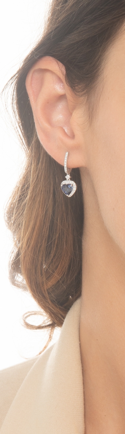 Earrings in white gold 18k with diamonds and blue sapphires heart cut, 6x6 mm
