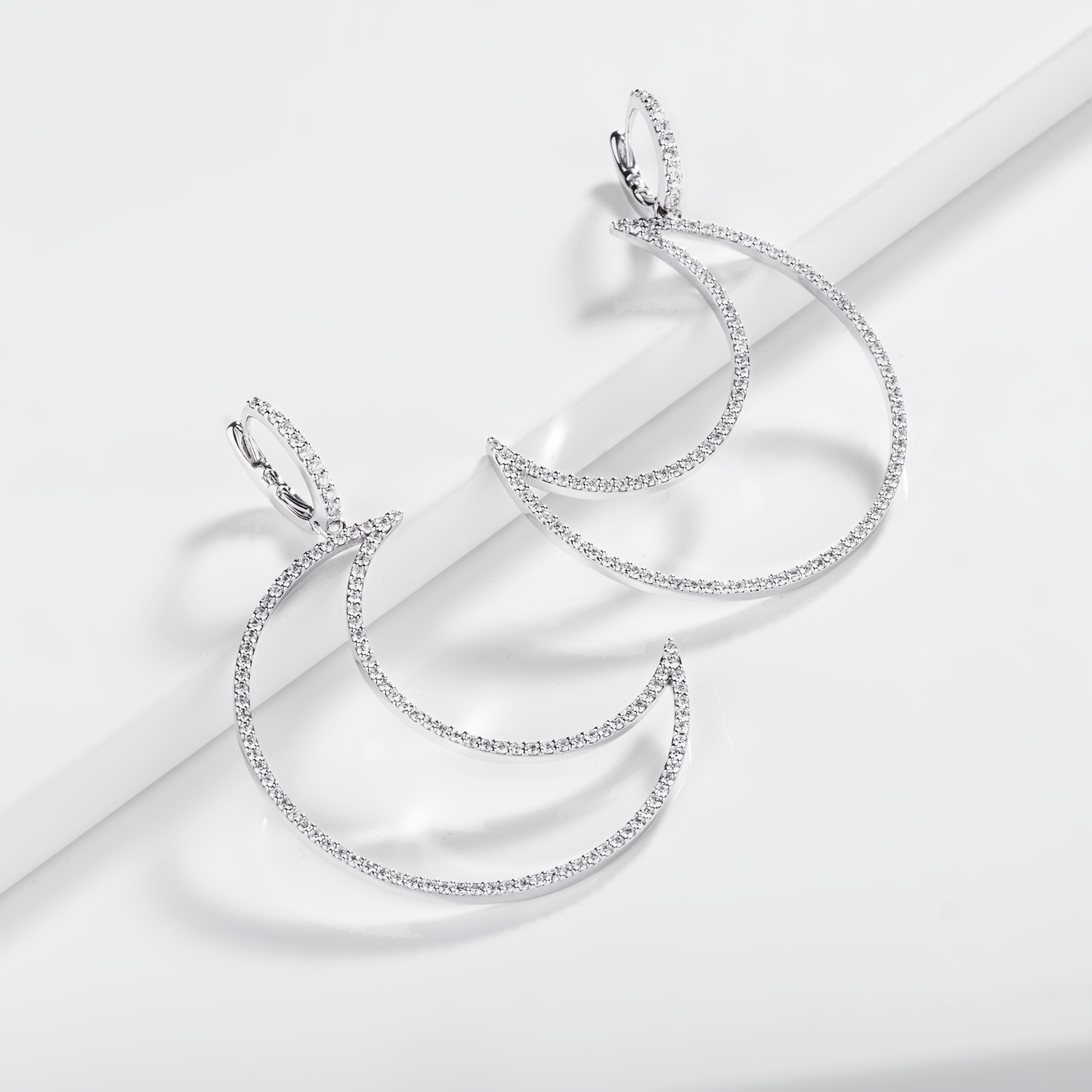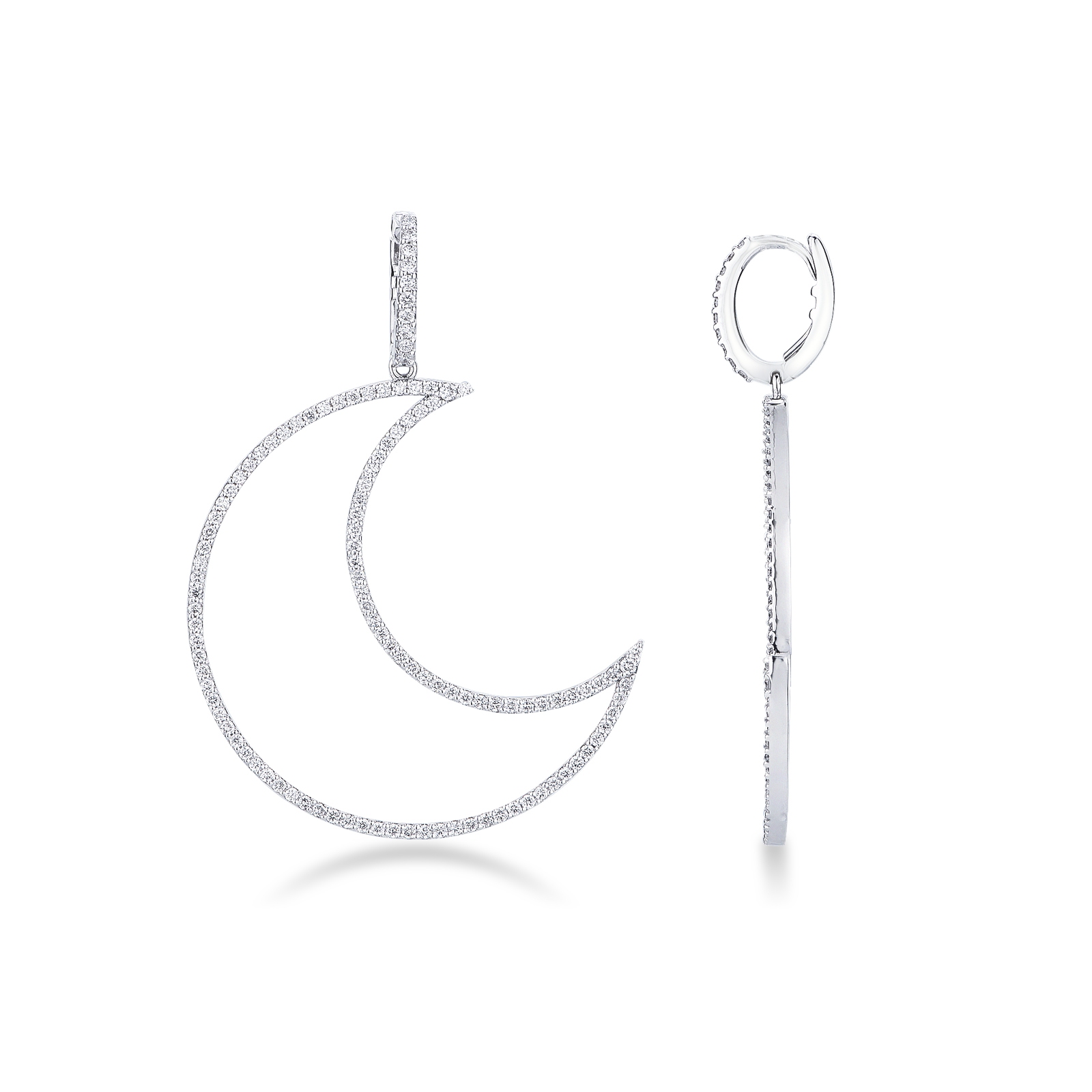 These pendant earrings showcase a pavé-set hoop adorned with a gracefully suspended crescent moon charm which is also completely covered in white diamonds.