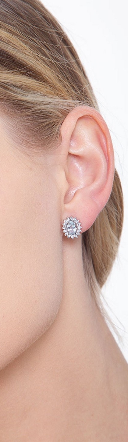 18k white gold stud earrings with aquamarine oval cut and diamonds halo