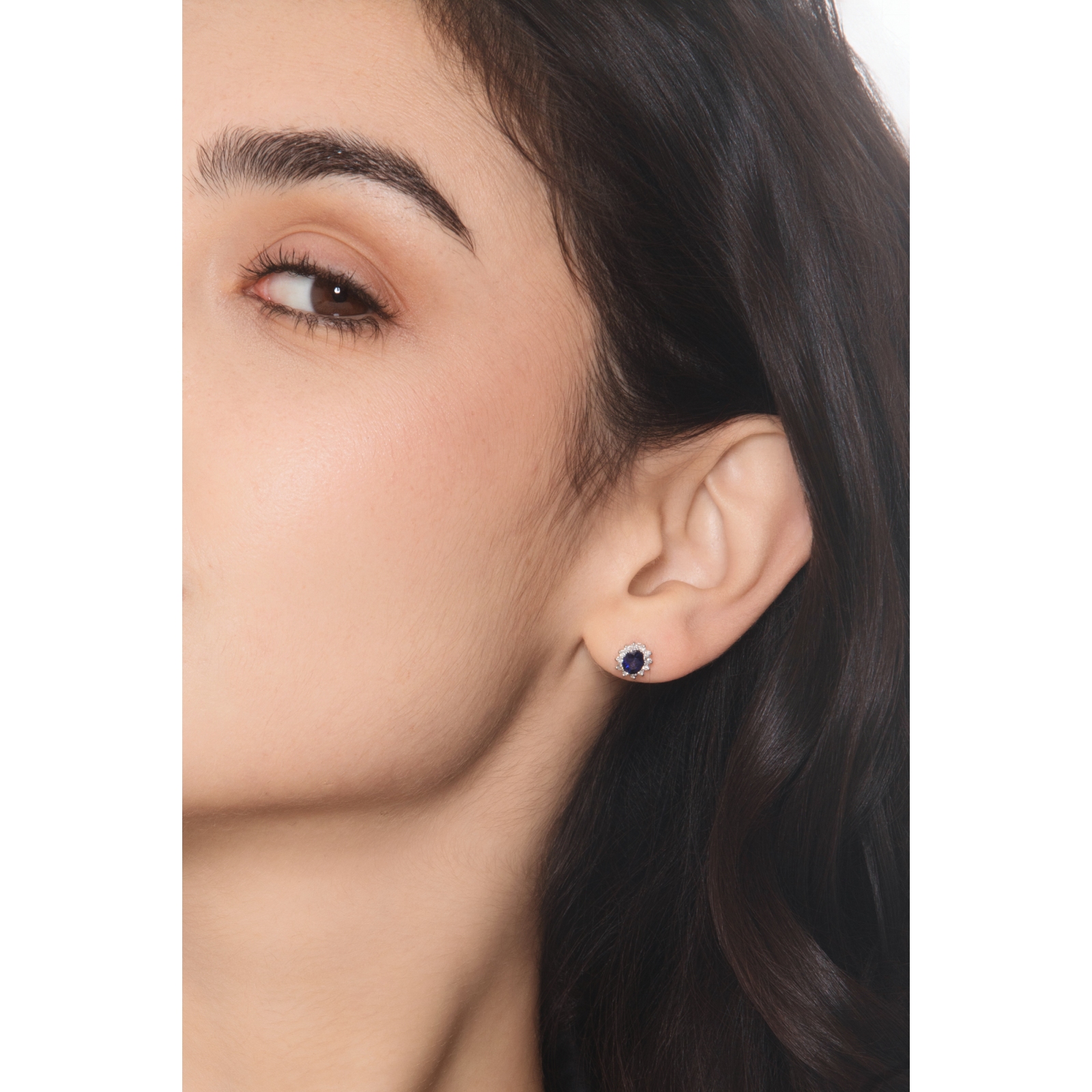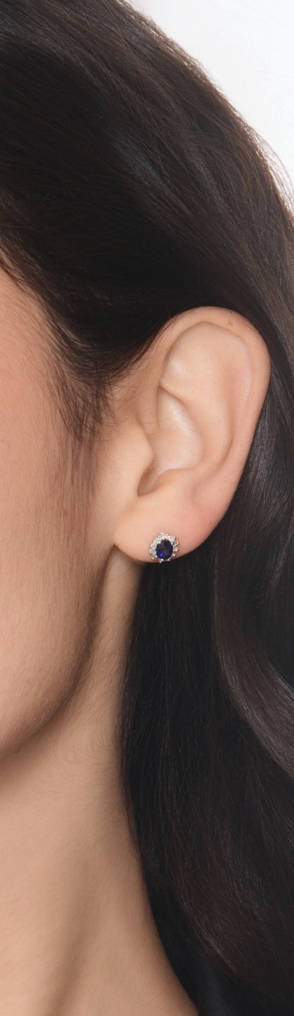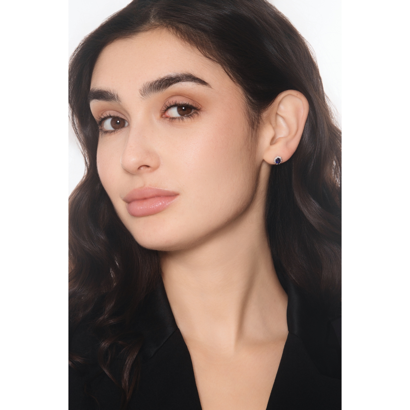 This 18kt white gold earrings feature a central blue sapphire surrounded by a halo of white brilliant cut diamonds with colour H and clarity VS. The central stone measures approximately 5x4mm.