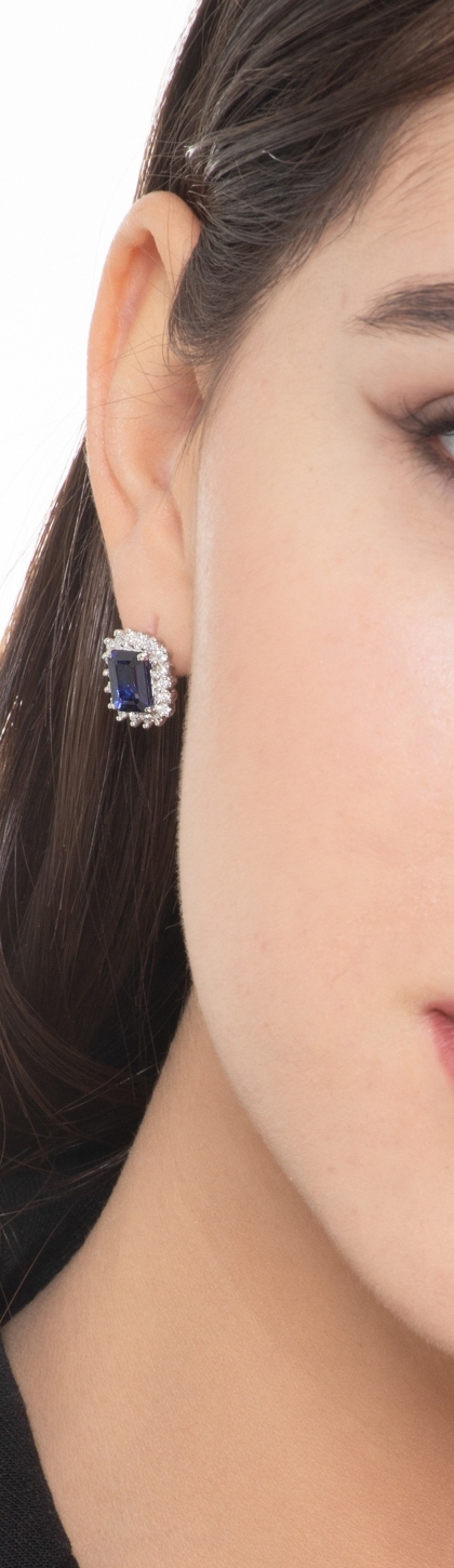 Halo stud earrings in white gold 18k with diamonds and blue sapphires