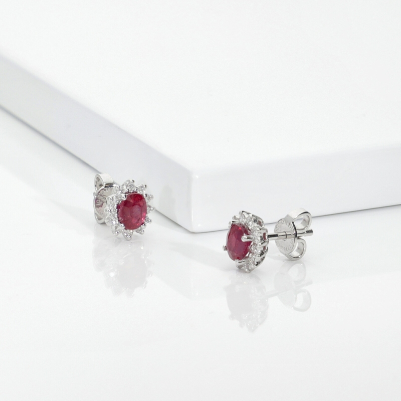 This 18kt white gold earrings feature a central ruby surrounded by a halo of white brilliant cut diamonds with colour H and clarity VS. The central stone measures approximately 5x4mm.