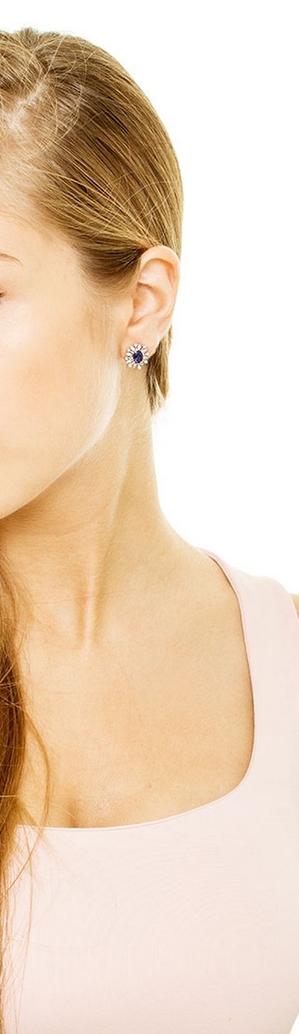 White gold 18k halo stud earrings with blue sapphires and diamond petals