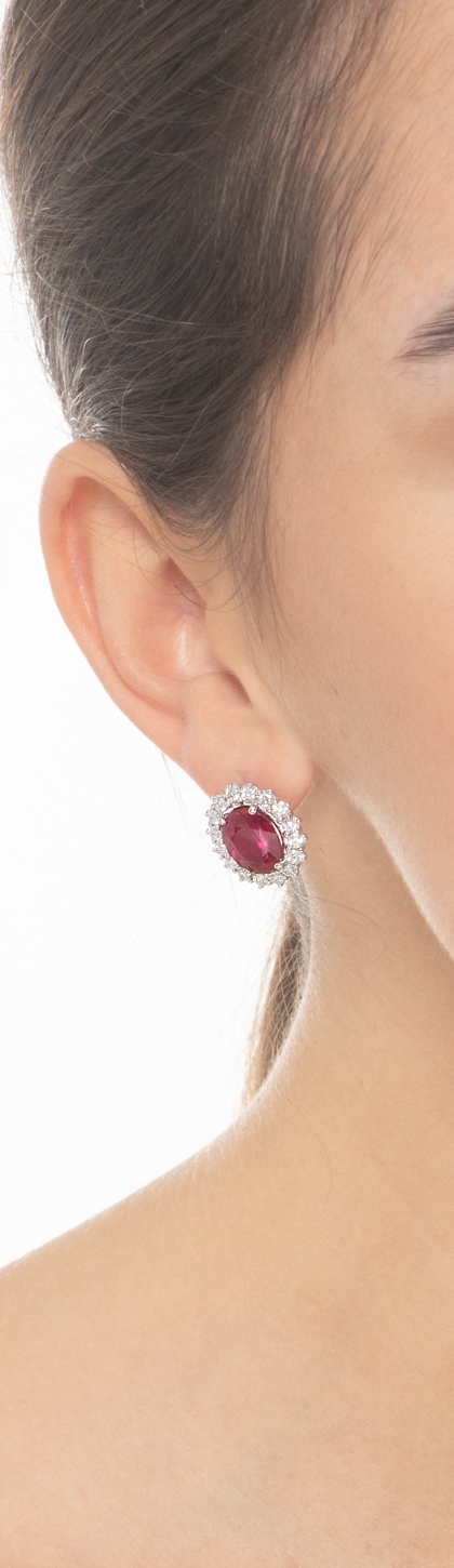 White gold 18k stud earrings with oval cut rubies and diamonds halo