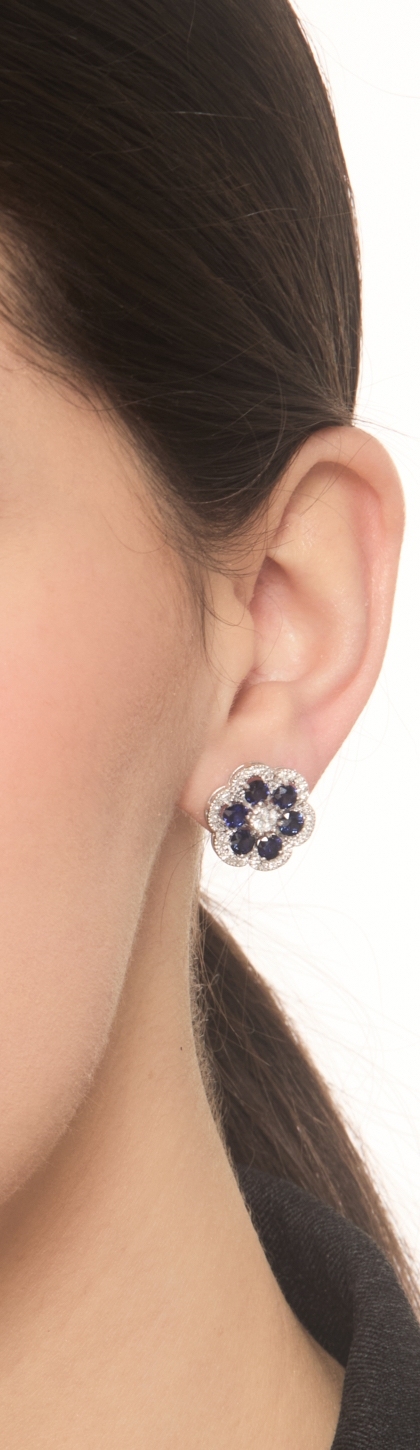 Flower earrings in white gold 18k with blue sapphires and diamonds