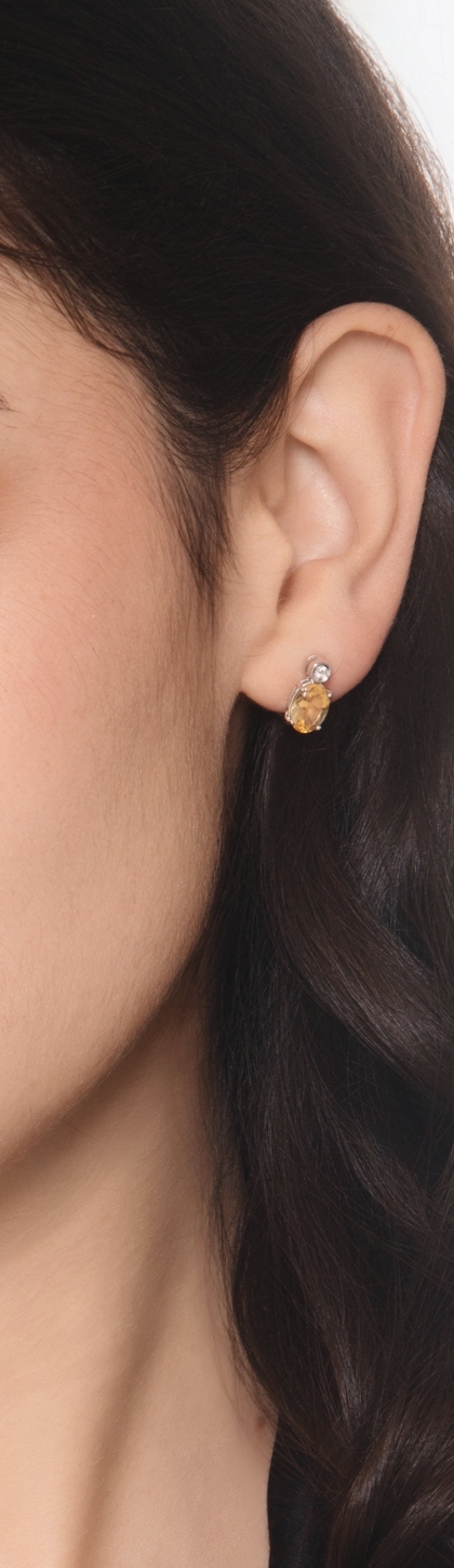Classy and colorful stud earrings, perfect for a birthday, graduation or wedding anniversary gift. They feature a oval-cut yellow citrine embellished with a bezel-set white diamond. It is brilliant-cut and has H color and VS clarity, which is the perfect combination between shine and quality.