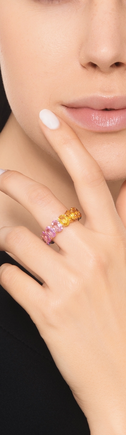 Eternity ring with multicolar rainbow oval sapphires in yellow gold 18k.