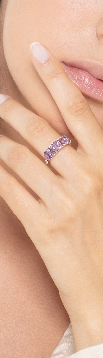 18k white gold ring with five amethysts oval cut and diamonds shoulder set