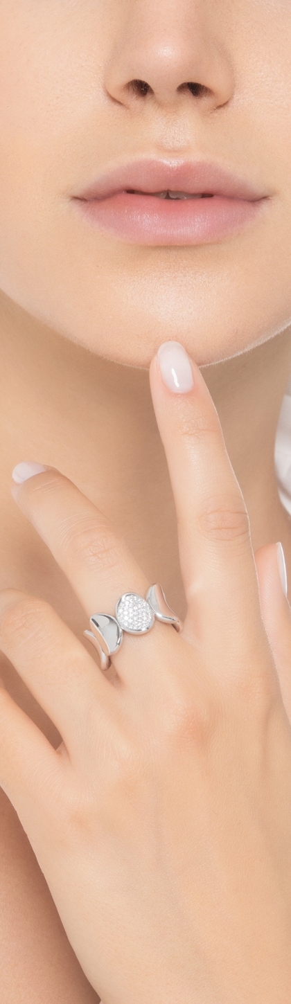 Elastic ring in white gold 18k with 6 oval platelet and one pavè diamonds plate