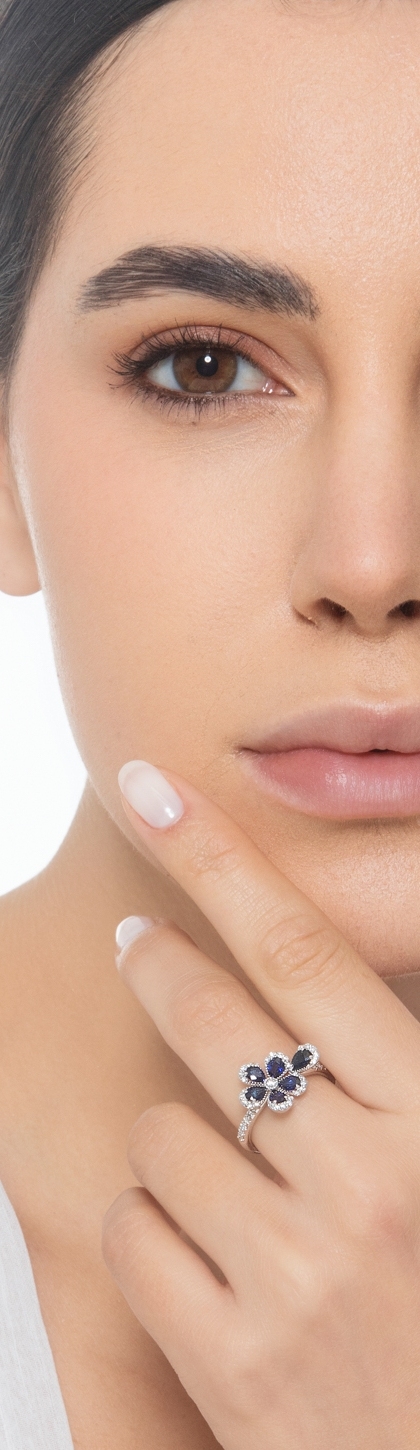 Flower ring in white gold 750 with blue sapphires and diamonds
