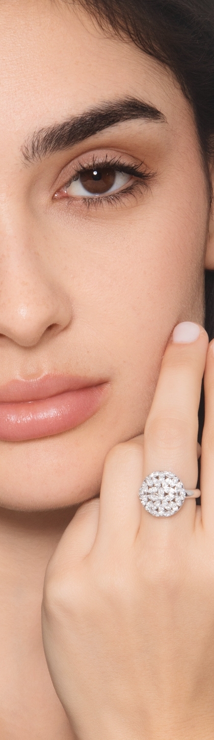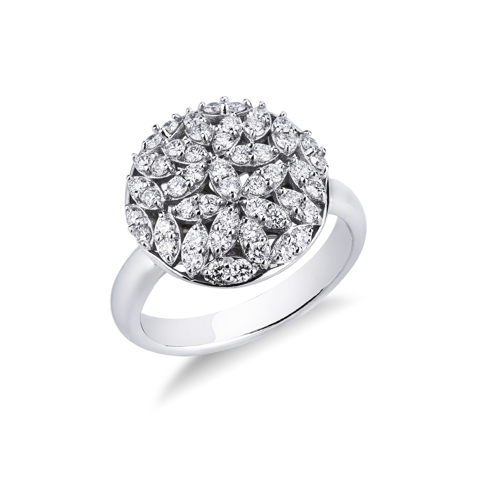 Classy and sophisticated, this diamond ring features a round geometric design in which our skilled goldsmiths have set brilliant-cut white diamonds. They are placed in a faux marquise structure in order to create a stunning intricate design that reminds of a flower bouquet.
