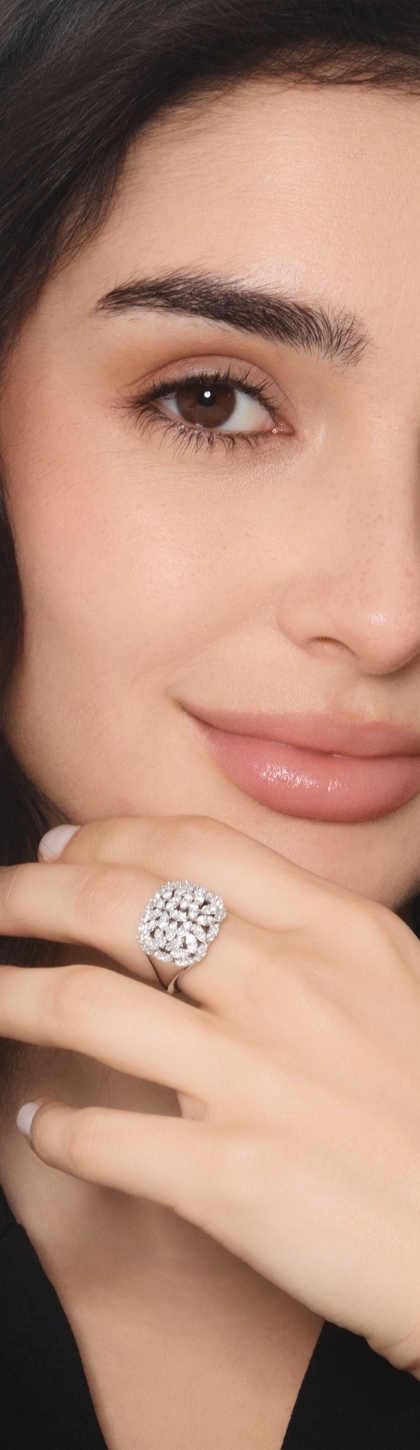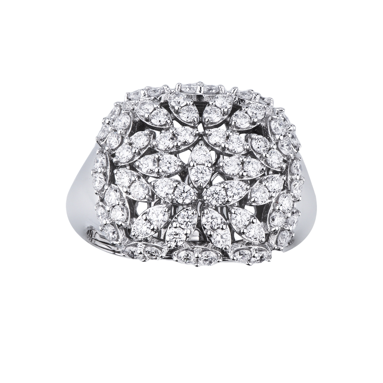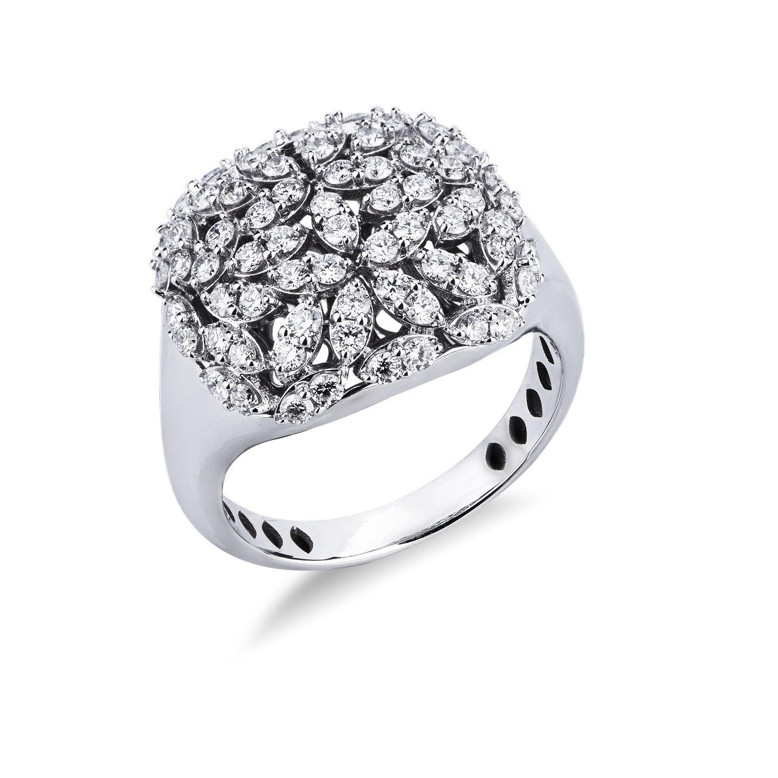 Classy and sophisticated, this diamond ring features an entirely pavé rectangular surface in which our skilled goldsmiths have set brilliant-cut white diamonds. They are placed in a faux marquise structure in order to create a stunning intricate design that beautifully capture and reflect light. Hence, each faux marquise is set with two brilliant-cut diamonds.