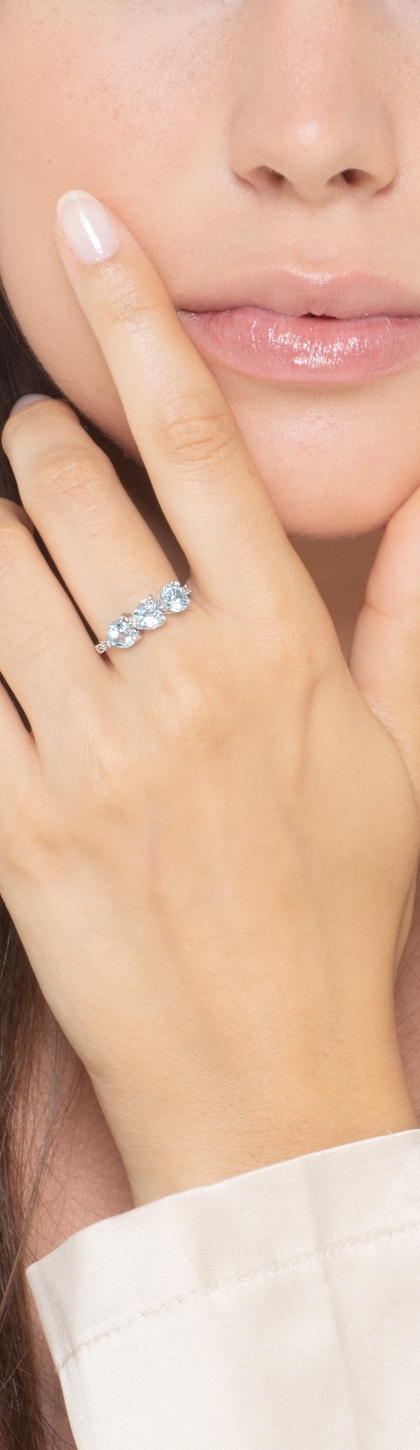 White gold 18k ring with three aquamarines heart cut and diamonds shoulder set