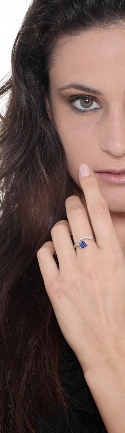 White gold ring with blue sapphire heart cut and a row of diamonds