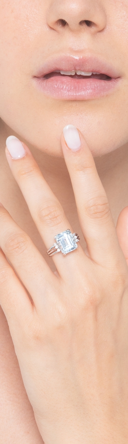 18k white gold ring with central aquamarine and 3 diamonds per side