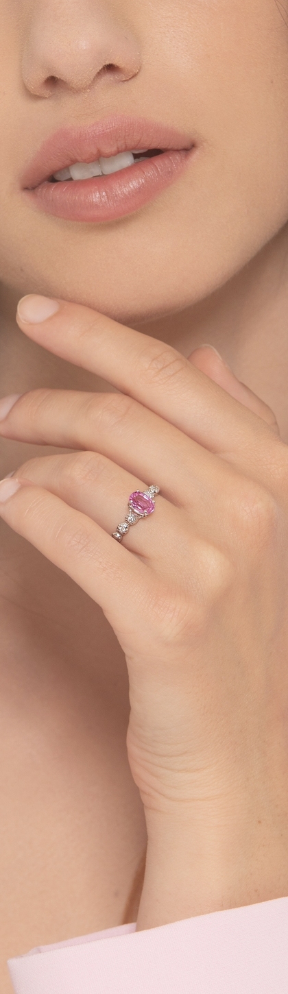 750 white gold ring with central pink sapphire and diamonds