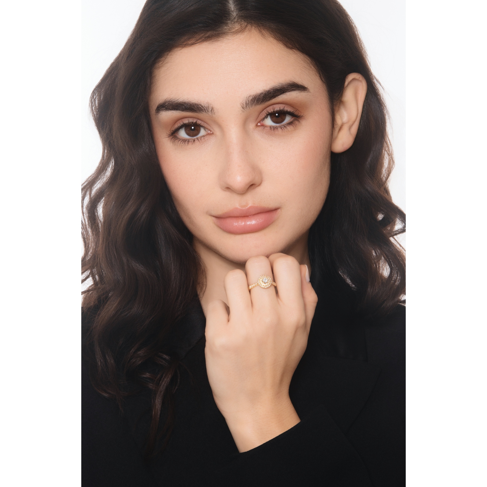 It features a double diamond pavè halo which beautifully frame another central diamond. The diamonds are brilliant-cut with colour H, clarity VS and are set in 18kt yellow gold. Finally, the yellow hues of the precious metal enhance the classic elegance of this jewelry piece.