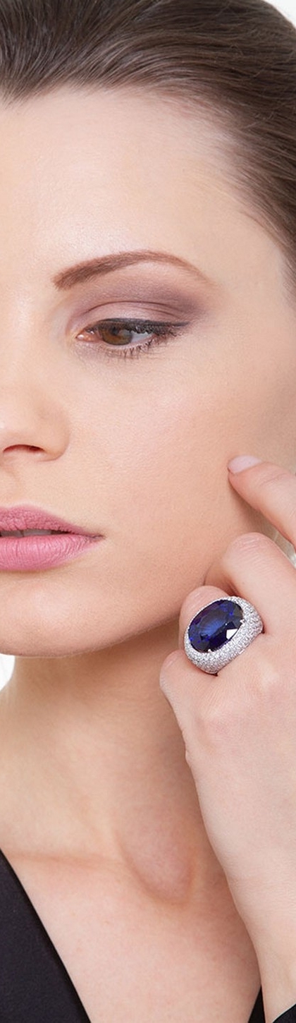 White gold 18k band ring with blue sapphire and diamonds pavé