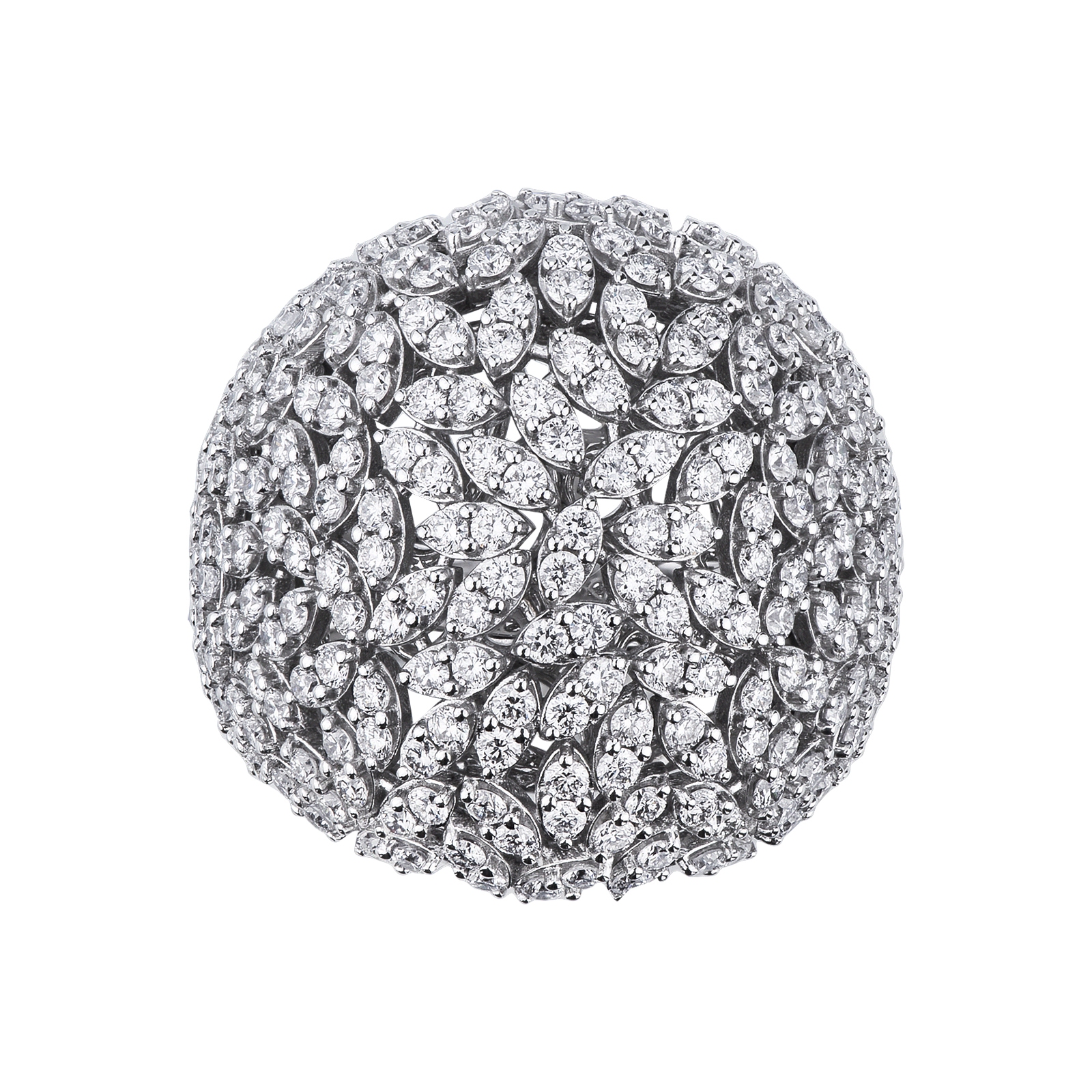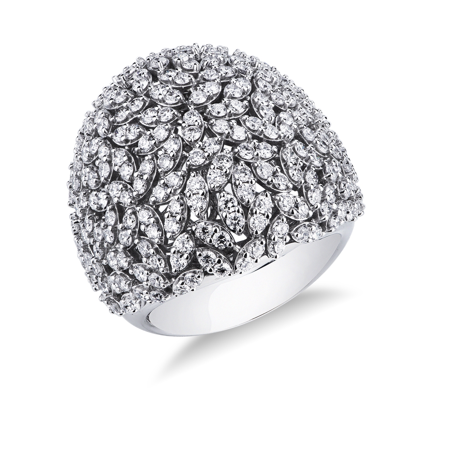 Stunning diamond pavé cocktail ring in 18kt white gold. It features a dome shaped design that is completely covered in brilliant-cut diamonds set in a marquise shaped structure. They have H color and VS clarity and form a beautiful intricate design that reminds of a flower bouquet.