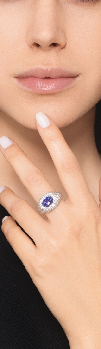 This chic and luxurious ring features a dome shape which is entirely covered in brilliant-cut white diamonds conveying a sophisticated and modern allure. These diamonds beautifully embrace a central tanzanite whose color strikes for the interplay of blue and violet hues.