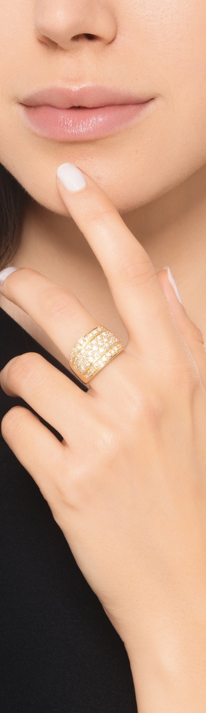 This wide 18kt yellow gold band features a pave-set diamond surface. These diamonds are brilliant-cut, have H color and VS clarity which gracefully balance quality and brilliance.