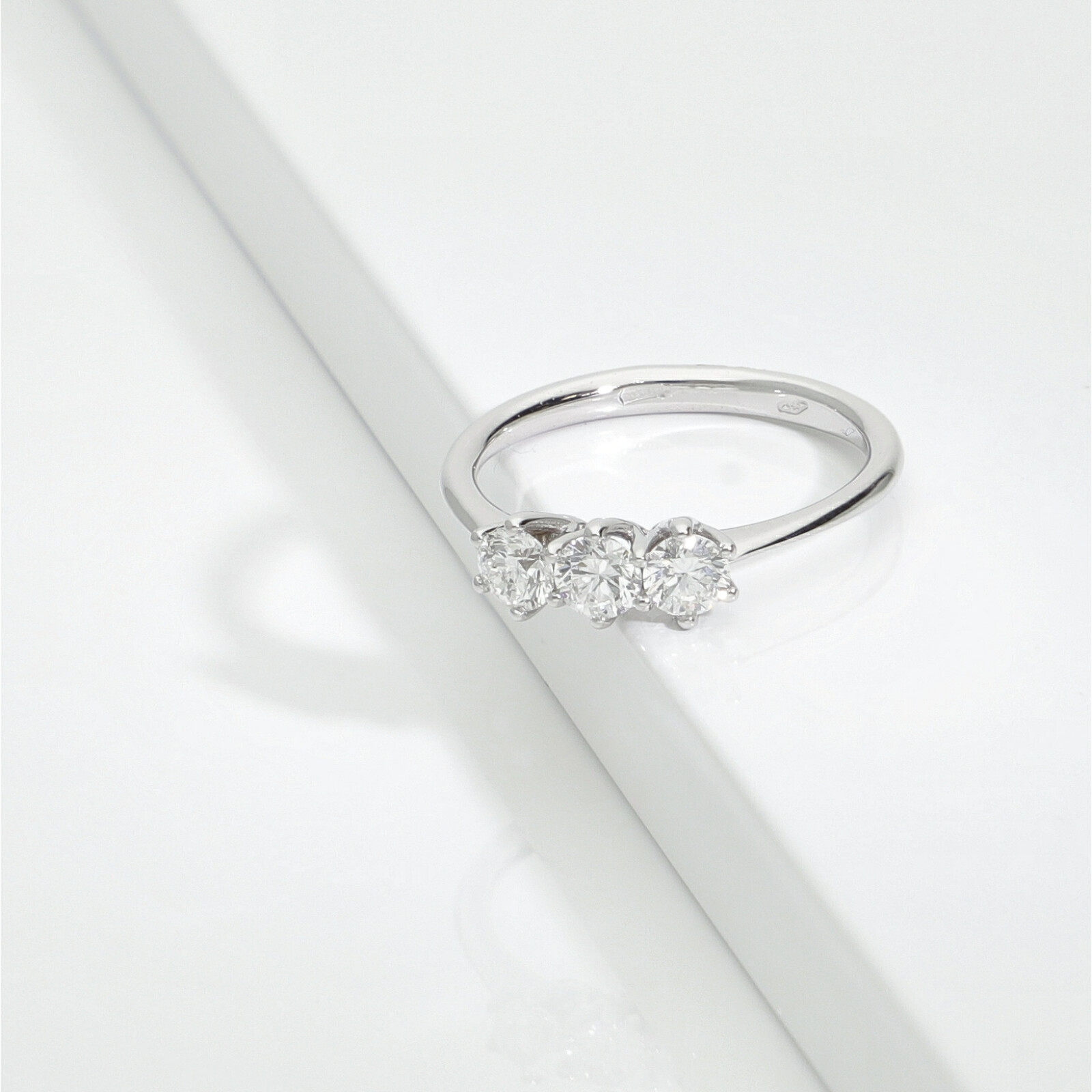 Crafted in 18kt white gold, this timeless design symbolizes enduring commitment and everlasting affection. Perfect as an engagement ring, anniversary gift or meaningful milestone piece, the trilogy ring combines symbolism with sophisticated style.