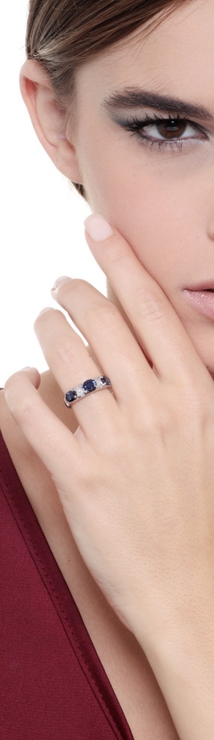 Trilogy ring in white gold 18k with blue sapphires and diamonds