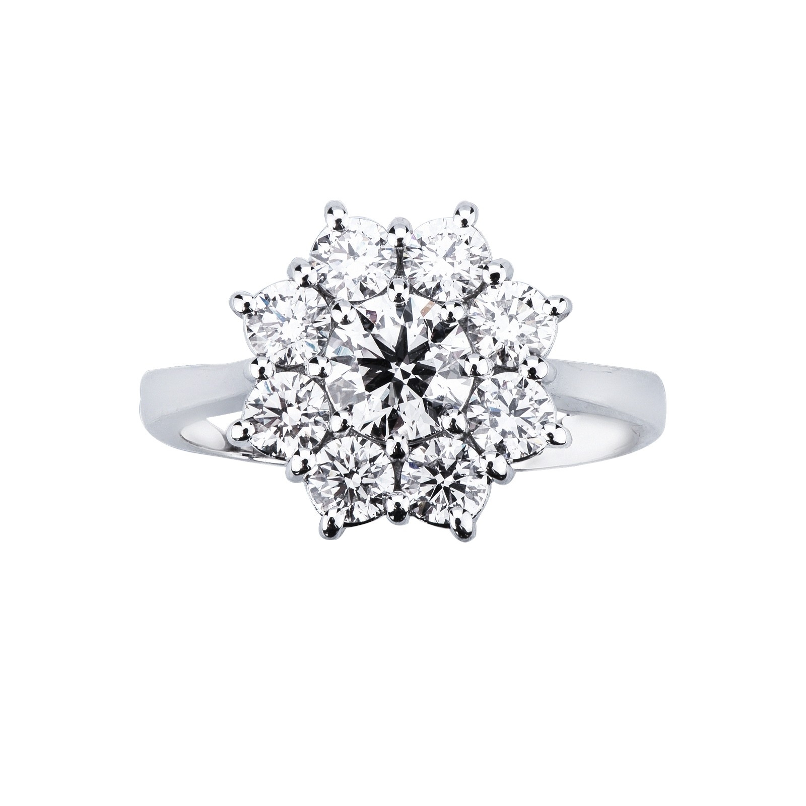 18k white gold halo flower ring with central diamond and diamonds brilliant cut, H color, Vs clarity.