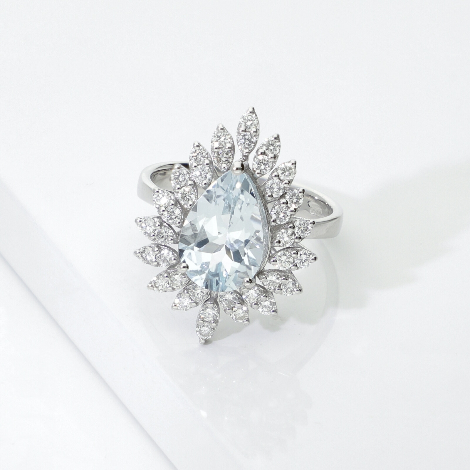 Ring in white gold 18k with aquamarine pear cut and diamonds brilliant cut, H color, Vs clarity. The aquamarine measures approximately 12x8 mm.