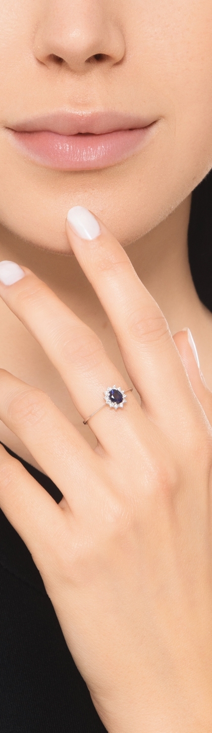 Blue sapphire diamond halo ring in18kt white gold
