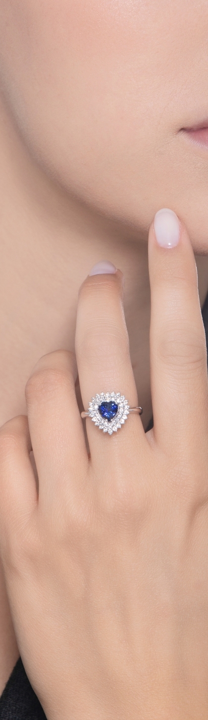 Romantic and feminine, this heart-shaped sapphire ring with a double diamond halo will not go unnoticed!