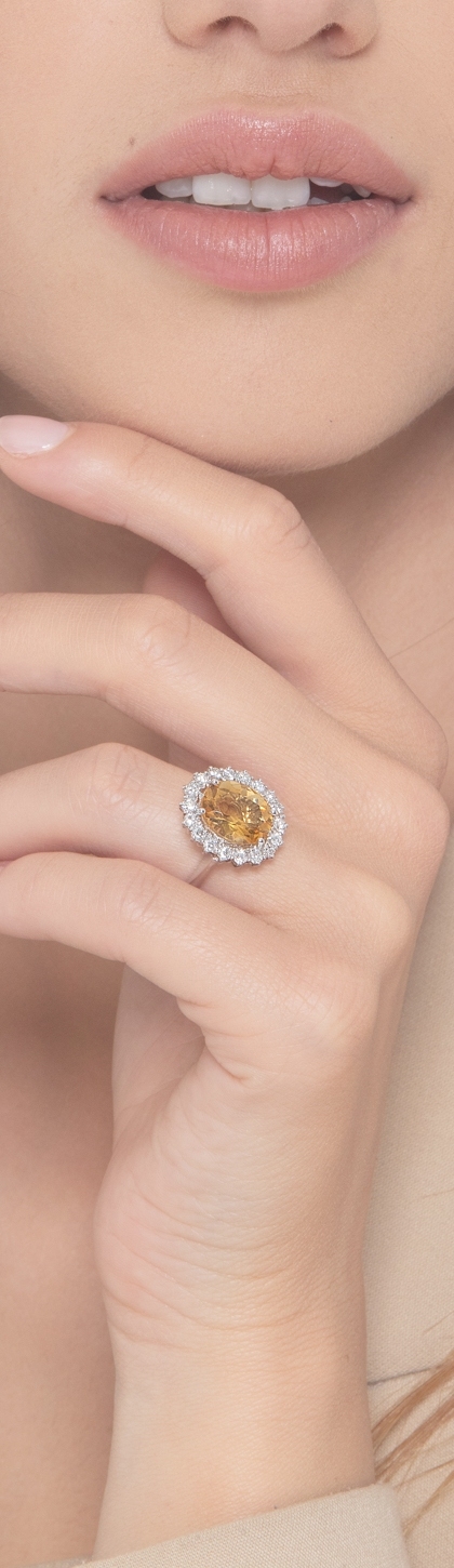 Citrine and diamonds halo ring in 18kt white gold