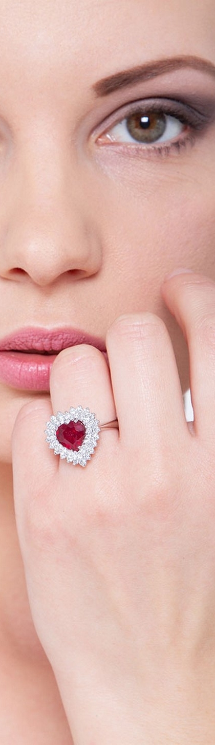 Diamond double halo ring with a heart cut ruby white gold 18k